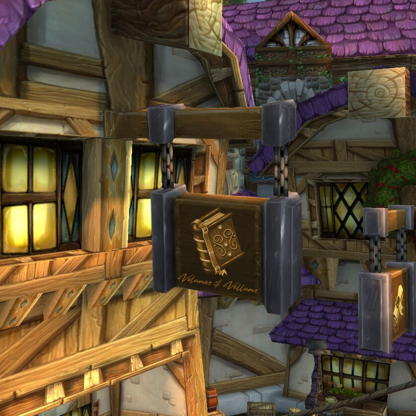 The rustic sign for Volumes & Vellums sways in the breeze over the shop at 27 Proudmore Lane. It’s a skinny brownstone wedged between the Glove & Gauntlet offices and an ink emporium. On the front door is the House Shadowstorm banner, in case you were wondering who the proprietor is. The shop window displays the latest published books in stock, seasonal holiday decorations hang outside.Upon walking into Volumes & Vellums one is greeted with bookshelves brimming with entertainment and knowledge. The familiar scent of bibliosmia immediately hits your senses. The first floor is filled with an assortment of books which one would expect to find in an establishment placed in the heart of Stormwind. It might be overwhelming at first, but that’s okay because the friendly staff at Volumes & Vellums always have a recommendation! By the cash register there is a framed sign: '10% proceeds donated to Moonbrook Schoolhouse in Westfall'.The second floor is roped off with a minimalist sign ‘employees only’. Near the stairwell is a door marked ‘Private’. Various members of House Shadowstorm are seen going to and fro from this door. Presumably this is a workspace for book orders of a more delicate nature.